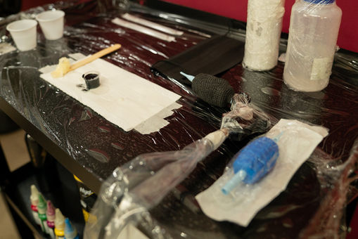 Além de ser um espaço fixo para nossos residentes, também recebemos artistas convidados (guests) e oferecemos materiais essenciais para o trabalho, como descartáveis, cosméticos, agulhas, biqueiras e tintas preta e branca, sempre buscando expandir ainda mais nossa estrutura.